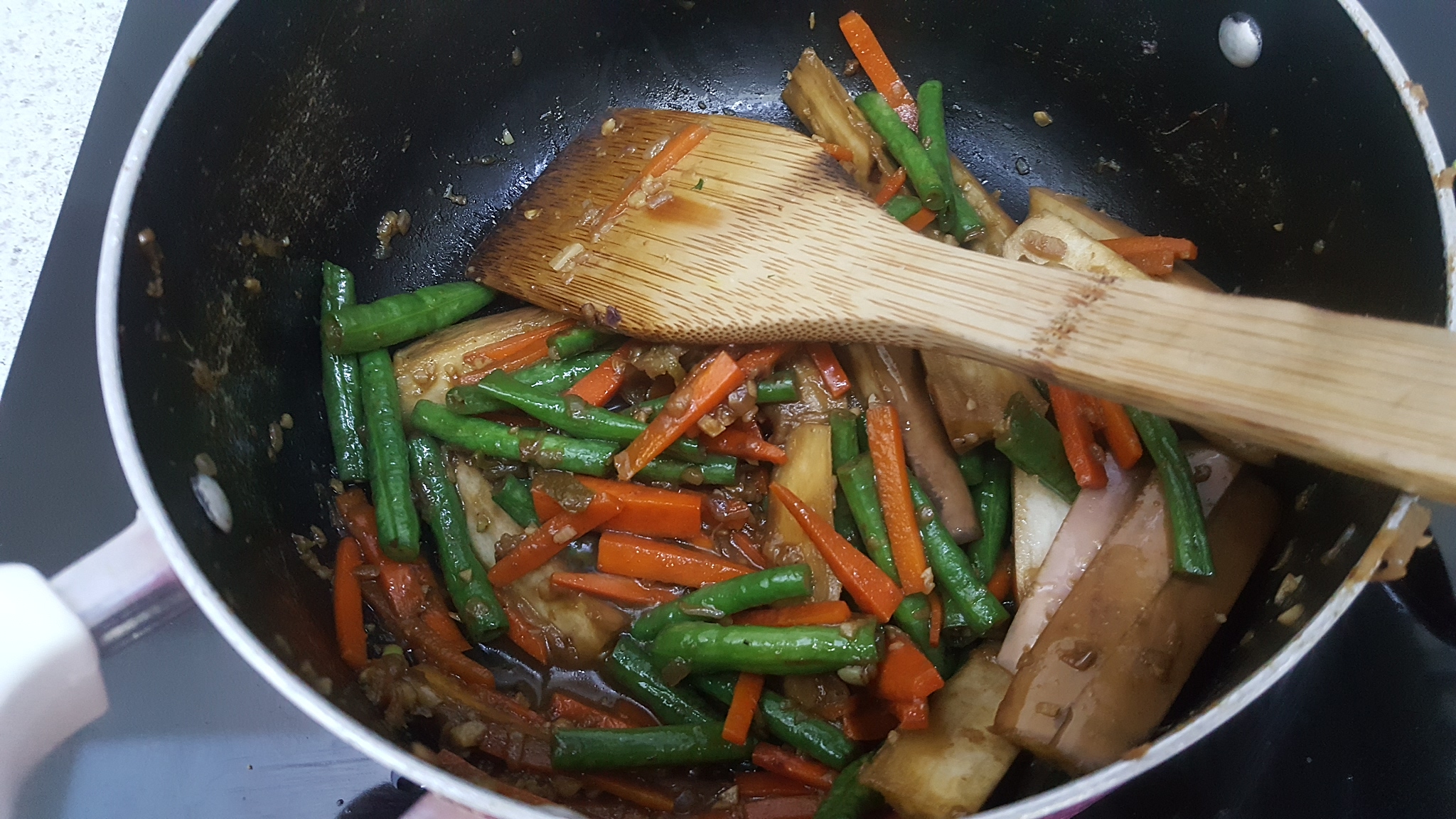 I had some remainder veggies: aubergine and long beans from fish curry and carrots in the fridge. When planning a meal, I try…