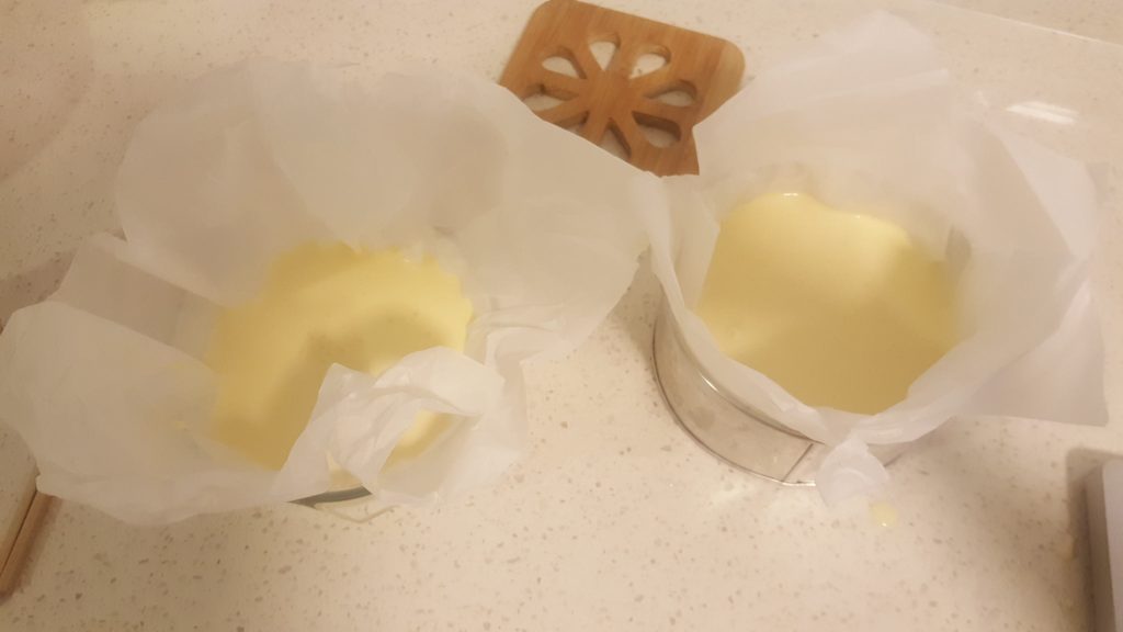 The recipe calls for a 7” circle cake tin. However, I used all the cream cheese and whipping cream in its packaging as I am not keen to have leftovers. So, I poured it into a 6” circle cake tin (70%) and poured the remaining in a smaller pyrex.