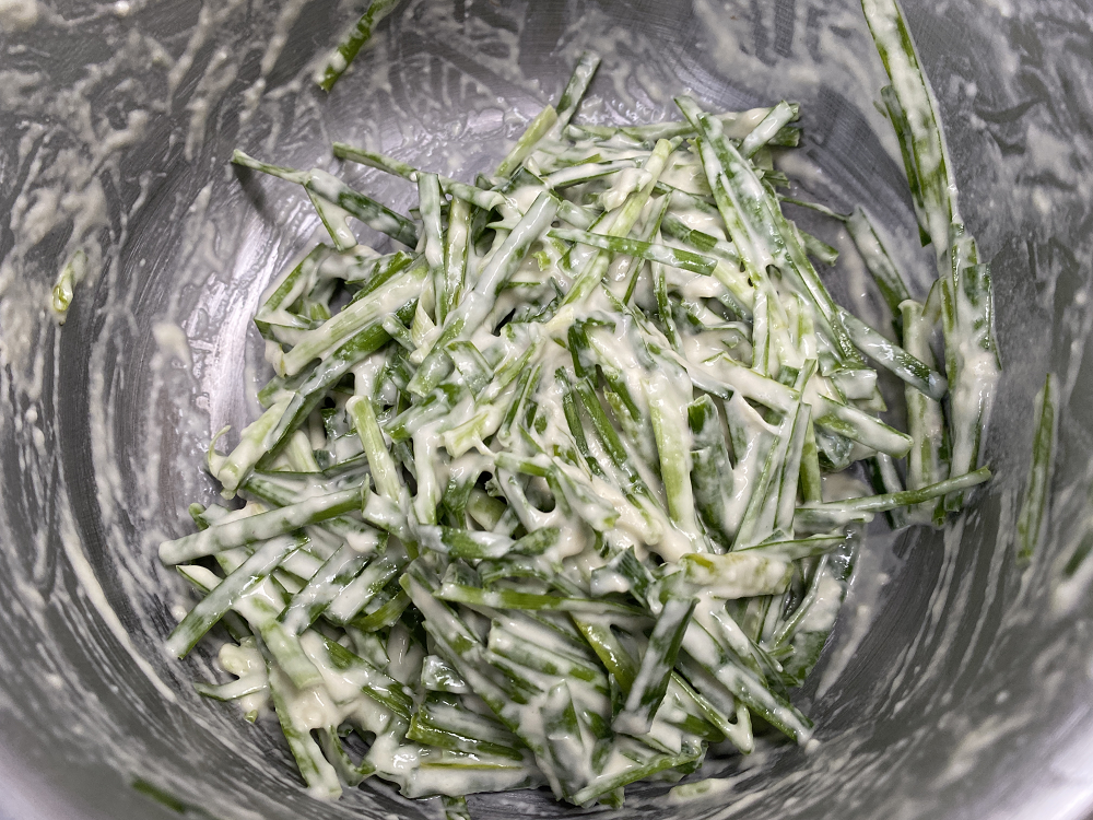 After washing the Chinese chives, it is still quite wet. I didn’t bother draining it and added the flour. After that, I added tablespoons of water into the bowl to mix and adjusted accordingly.